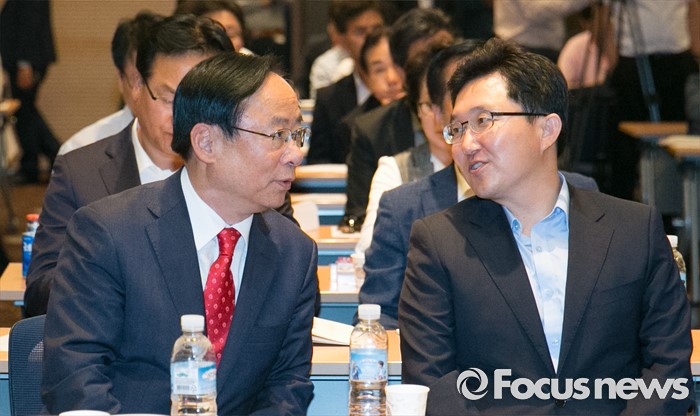 (서울=포커스뉴스) 11일 오후 서울 여의도 중소기업중앙회관에서 열린 새누리당 전국원외위원장협의회 전체회의에 전당대회 출마를 선언한 이주영(왼쪽), 김용태 의원이 대화하고 있다.