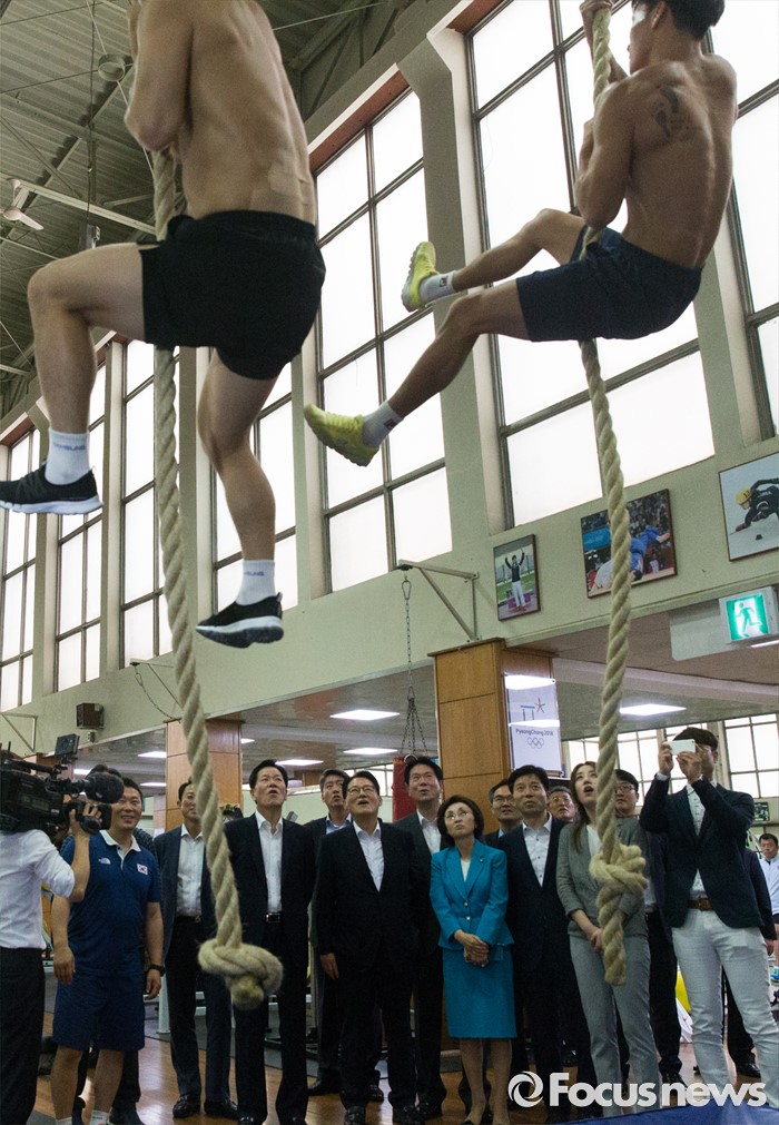 (서울=포커스뉴스) 박지원 국민의당 비상대책위원장을 비롯한 주요 당직자들이 11일 오후 서울 노원구 태릉선수촌에 방문해 국가대표 선수들의 훈련을 지켜보고 있다.