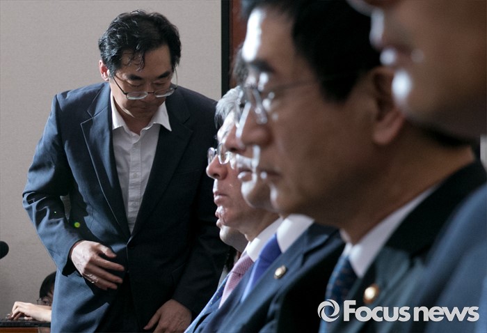 (서울=포커스뉴스) 11일 오후 서울 여의도 국회에서 열린 교육문화체육관광위원회 전체회의에 "민중은 개·돼지"라고 발언해 물의를 빚은 나향욱(왼쪽) 교육부 정책기획관이 참석해 의원들의 질의에 답하고 있다. 오른쪽 두번째 이준식 사회부총리 겸 교육부 장관.