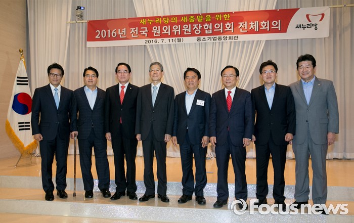 한편, 이날 회의에는 이주영 정병국 한선교 이정현 김용태 의원 등 전당대회 출마를 선언한 당권주자들이 총출동해 원외당협위원장들에게 지지를 호소했다.11일 오후 서울 여의도 중소기업중앙회관에서 열린 새누리당 전국원외위원장협의회 전체회의에 참석한 지도부와 전당대회 출마자 등이 취재진을 향해 포즈를 취하고 있다. 왼쪽부터 정병국 의원, 심재철 국회 부의장, 박명재 사무총장, 김희옥 혁신비대위원장, 이성헌 전국원외위원장협의회장, 이주영, 김용태, 강석호 의원. 2016.07.11 박동욱 기자 11일 오후 서울 여의도 중소기업중앙회관에서 열린 새누리당 전국원외위원장협의회 전체회의에 참석한 이준석 노원병 위원장이 주제발표를 하고 있다. 2016.07.11 박동욱 기자
