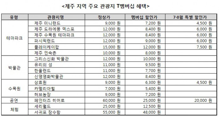 이번 제휴를 통해 T멤버십 혜택을 받을 수 있는 곳은 제주도 내 △테마파크 6곳 △박물관 4곳 △수목원 3곳 등으로 고객은 제휴처에 따라 20%에서 최대 58% 할인을 받을 수 있다.