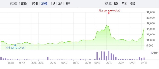 보광산업은 12일 오전 9시19분 현재 전 거래일 대비 29.66%(3500원) 상승한 1만5300원에 거래되고 있다. 보광산업은 8일과 11일에도 각각 9.09%, 3.51%의 상승폭을 기록했다.