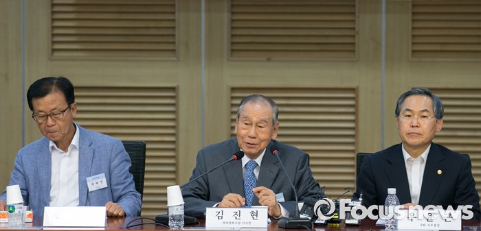 (서울=포커스뉴스) 12일 오전 서울 여의도 국회 의원회관에서 국가전략포럼 주최로 열린 국민이 바라는 개헌, 어떻게 할 것인가? 세미나에 참석한 김진현 세계평화포럼 이사장이 인사말을 하고 있다. 왼쪽부터 원혜영 더불어민주당 의원, 김 이사장, 우윤근 국회 사무총장.
