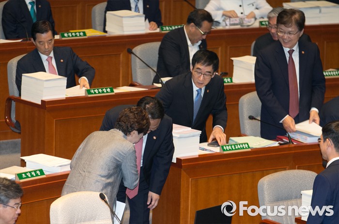 (서울=포커스뉴스) 12일 오전 서울 여의도 국회에서 2015회계연도 결산을 위해 열린 예산결산특별위원회 전체회의에 참석한 김현미(왼쪽) 위원장과 유일호 경제부총리 겸 기획재정부 장관이 인사하고 있다.