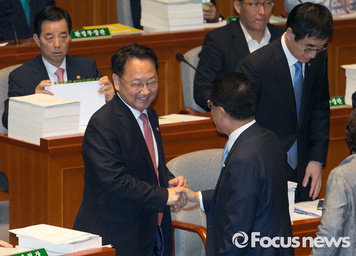 (서울=포커스뉴스) 12일 오전 서울 여의도 국회에서 2015회계연도 결산을 위해 열린 예산결산특별위원회 전체회의에 참석한 유일호(왼쪽) 경제부총리 겸 기획재정부 장관과 정운천 새누리당 의원이 인사하고 있다.