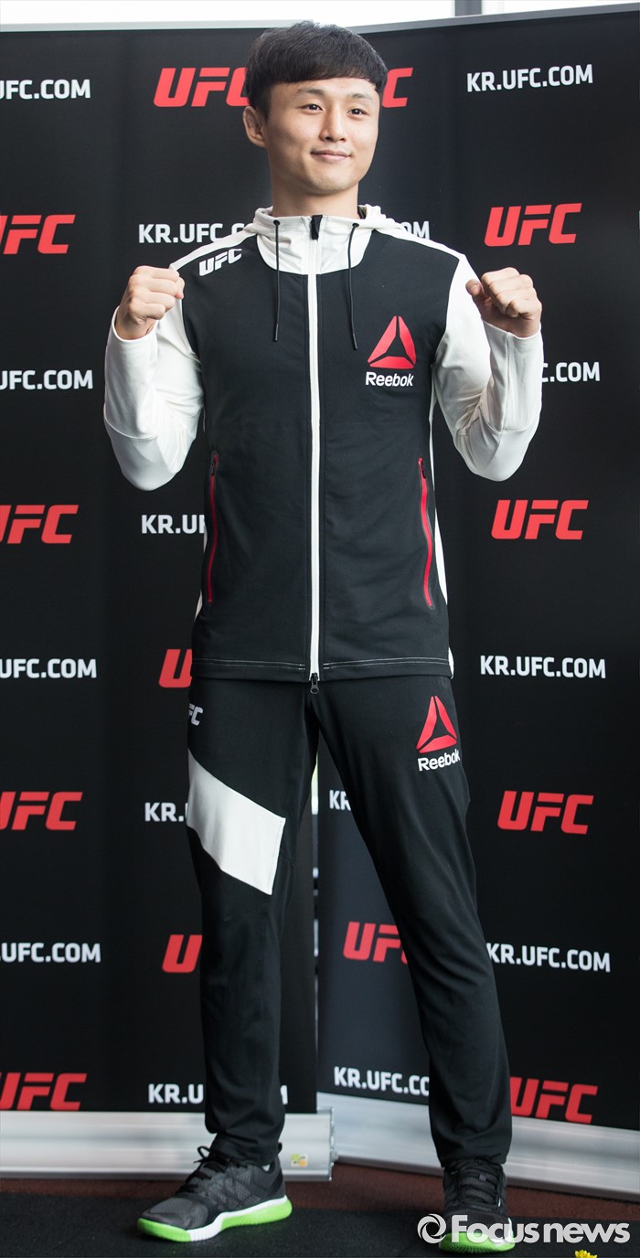 (서울=포커스뉴스) 지난 9일 티아고 타바레스(31, 브라질)를 1라운드 2분 42초에 TKO로 제압하고, UFC 3연속 KO 승리라는 쾌거를 이루고 귀국한 ‘코리안 슈퍼보이’ 최두호가 선수가 12일 오전 서울 여의도 리복 센티널 IFC에서 기자회견에 앞서 포토타임을 갖고 있다.