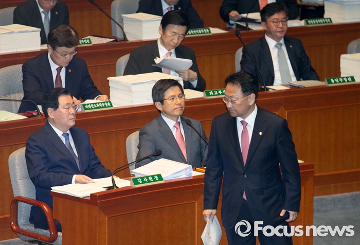 (서울=포커스뉴스) 12일 오전 서울 여의도 국회에서 2015회계연도 결산을 위해 열린 예산결산특별위원회 전체회의에 참석한 유일호(앞줄 오른쪽) 경제부총리 겸 기획재정부 장관이 제안설명을 마친 뒤 자리로 향하고 있다.