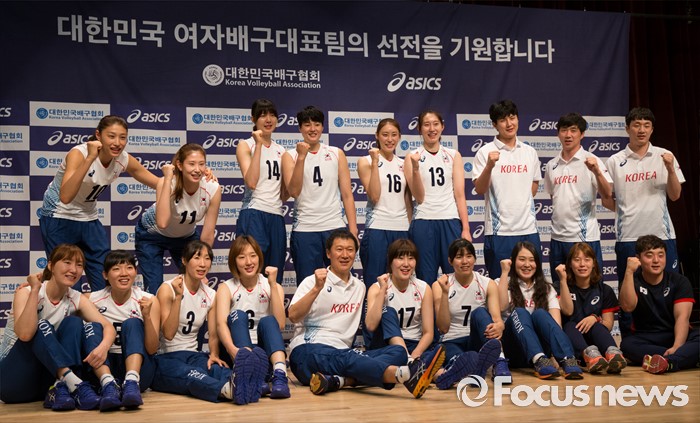(진천=포커스뉴스) 12일 오전 충북 진천 선수촌 대강당에서 열린 '대한민국 여자배구 국가대표선수단 기자회견'에 참석한 이정철 감독, 코칭스태프 및 선수들이 포즈를 취하고 있다. 이날 기자회견을 가진 여자배구 선수단은 리우올림픽을 대비해 23일 네덜란드로 전지훈련을 떠날 계획이다.