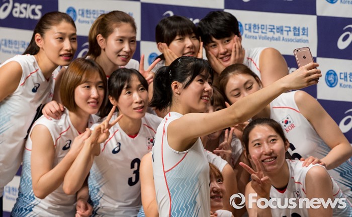 (진천=포커스뉴스) 12일 오전 충북 진천 선수촌 대강당에서 열린 '대한민국 여자배구 국가대표선수단 기자회견'에 참석한 선수들이 포즈를 취하고 있다. 이날 기자회견을 가진 여자배구 선수단은 리우올림픽을 대비해 23일 네덜란드로 전지훈련을 떠날 계획이다.