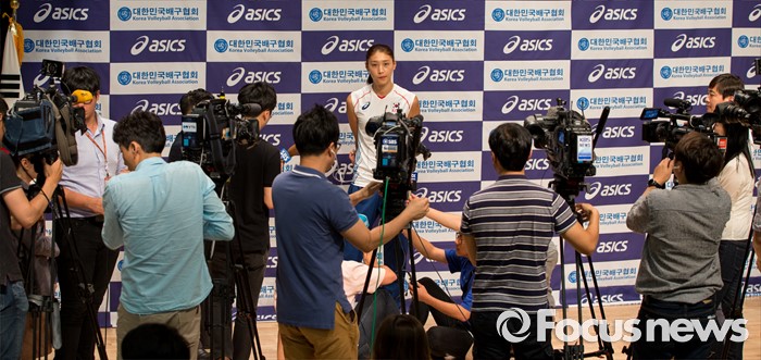 (진천=포커스뉴스) 12일 오전 충북 진천 선수촌 대강당에서 열린 '대한민국 여자배구 국가대표선수단 기자회견'에 참석한 김연경 선수가 취재진의 질문에 답하고 있다. 이날 기자회견을 가진 여자배구 선수단은 리우올림픽을 대비해 23일 네덜란드로 전지훈련을 떠날 계획이다.