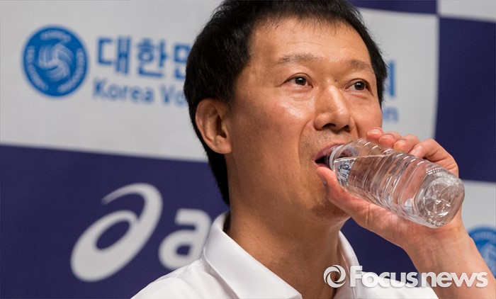(진천=포커스뉴스) 12일 오전 충북 진천 선수촌 대강당에서 열린 '대한민국 여자배구 국가대표선수단 기자회견'에 참석한 이정철 감독이 물을 마시고 있다. 이날 기자회견을 가진 여자배구 선수단은 리우올림픽을 대비해 23일 네덜란드로 전지훈련을 떠날 계획이다.
