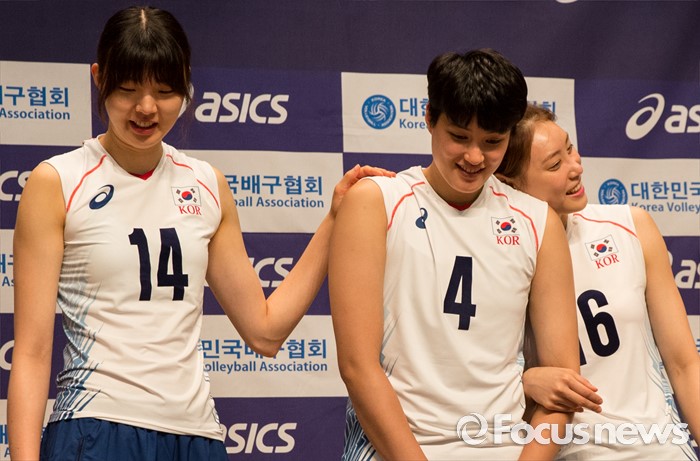 (진천=포커스뉴스) 12일 오전 충북 진천 선수촌 대강당에서 열린 '대한민국 여자배구 국가대표선수단 기자회견'에 참석한선수들이 포즈를 취하고 있다. 이날 기자회견을 가진 여자배구 선수단은 리우올림픽을 대비해 23일 네덜란드로 전지훈련을 떠날 계획이다.