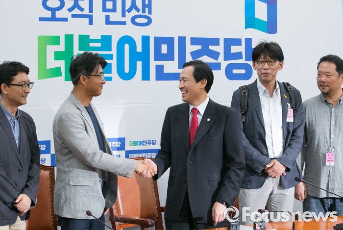 (서울=포커스뉴스) 우상호(오른쪽 세번째) 더불어민주당 원내대표가 12일 오전 서울 여의도 국회에서 열린 MB정권 이후 해직언론인과의 면담에 참석해노종면(왼쪽 두번째) YTN 해직기자 등과 인사하고 있다.