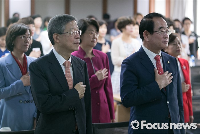 (서울=포커스뉴스) 김희옥(왼쪽) 새누리당 혁신비대위원장과 박명재 사무총장 등이 12일 오후 서울 여의도 중소기업중앙회에서 열린 2016 양성평등 포럼에 참석해 국기에 대한 경례를 하고 있다.