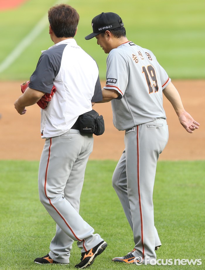 (서울=포커스뉴스) 12일 서울 잠실구장에서 열린 2016 프로야구 한화-LG 경기에서 1회말 수비 동작 도중 왼쪽 다리를 부상당한 한화 투수 송신영이 트레이너의 부축을 받으며 불펜으로 들어가고 있다.
