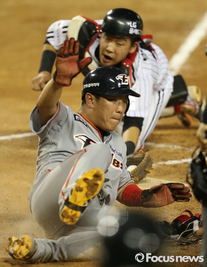(서울=포커스뉴스) 12일 서울 잠실구장에서 열린 2016 프로야구 한화-LG 경기 5회초 1사 2,3루에서 한화 송광민의 좌중간 안타때 2루주자 정근우가 홈에서 슬라이딩하며 세이프되고 있다.