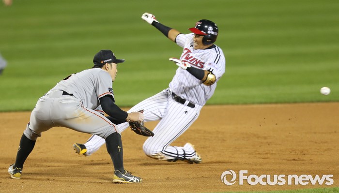 (서울=포커스뉴스) 12일 서울 잠실구장에서 열린 2016 프로야구 한화-LG 경기 7회말 2사 1,2루에서 LG 채은성이 2타점 우중간 3루타를 치고 슬라이딩하며 3루로 들어가고 있다.