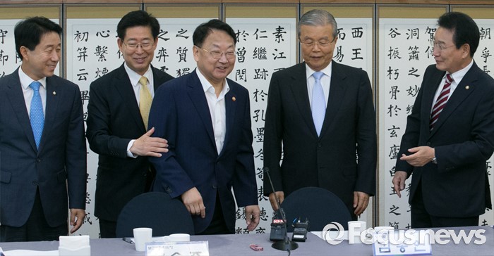 (서울=포커스뉴스) 13일 오전 서울 여의도 국회 귀빈식당에서 열린 더불어민주당 저출산 해소를 위한 국민연금 공공투자 특별위원회 1차 정책협의회에 참석한 김종인 비대위 대표, 유일호 경제부총리 겸 기획재정부 장관과 의원들이 취재진을 향해 포즈를 취하고 있다. 왼쪽부터 조정식 국토교통위원장, 양승조 보건복지위원장, 유 부총리, 김 대표, 변재일 정책위의장.