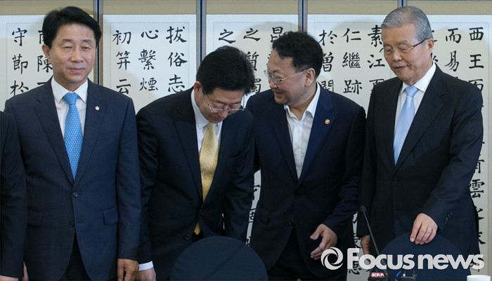 (서울=포커스뉴스) 13일 오전 서울 여의도 국회 귀빈식당에서 열린 더불어민주당 저출산 해소를 위한 국민연금 공공투자 특별위원회 1차 정책협의회에 참석한 김종인 비대위 대표, 유일호 경제부총리 겸 기획재정부 장관과 의원들이 취재진을 향해 포즈를 취한 뒤 자리로 향하고 있다. 왼쪽부터 조정식 국토교통위원장, 양승조 보건복지위원장, 유 부총리, 김 대표.