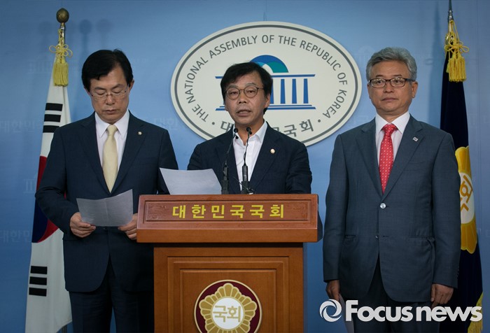(서울=포커스뉴스) 13일 오전 서울 여의도 국회 정론관에서 이완영(경북 고령·성주·칠곡, 가운데) 새누리당 의원과 이만희(왼쪽), 이철우 의원이 사드 대구 및 경북지역 사드배치와 관련 항의 기자회견을 하고 있다.