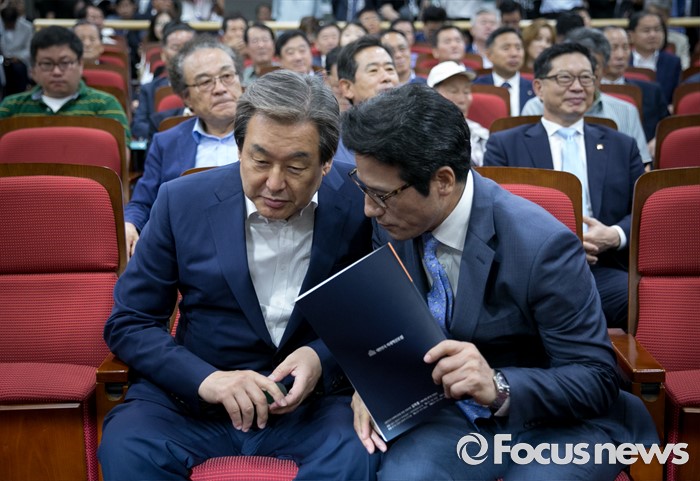 (서울=포커스뉴스) 13일 오전 서울 여의도 국회 의원회관에서 열린 대한민국 미래혁신포럼 창립기념 특강에 참석한 김무성(왼쪽) 새누리당 전 대표와 정병국 의원이 대화하고 있다.