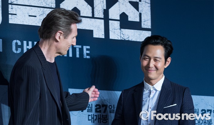 (서울=포커스뉴스) 13일 오전 서울 영등포구 콘래드 서울 호텔에서 열린 영화 '인천상륙작전' 기자간담회에 참석한 배우 리암 니슨(왼쪽)과 이정재가 포토타임을 갖고 있다.