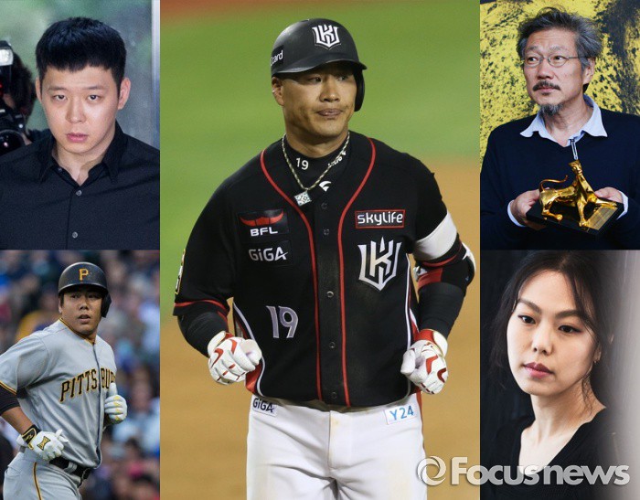 최근 화제의 중심에 서있는 가수 박유천(왼쪽상단부터 시계방향순으로), 야구선수 김상현, 영화감독 홍상수, 배우 김민희, 야구선수 강정호 사진자료 <사진출처=포커스뉴스, 게티이미지>