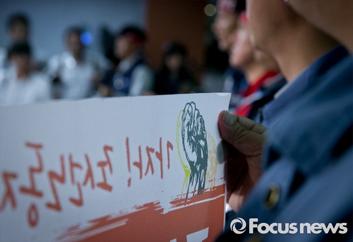 (서울=포커스뉴스) 13일 오전 서울 여의도 국회 정론관에서 조선업종노조연대 등 관계자들이 일방적 구조조정에 반대하는 총파업 선언 기자회견을 하고 있다.