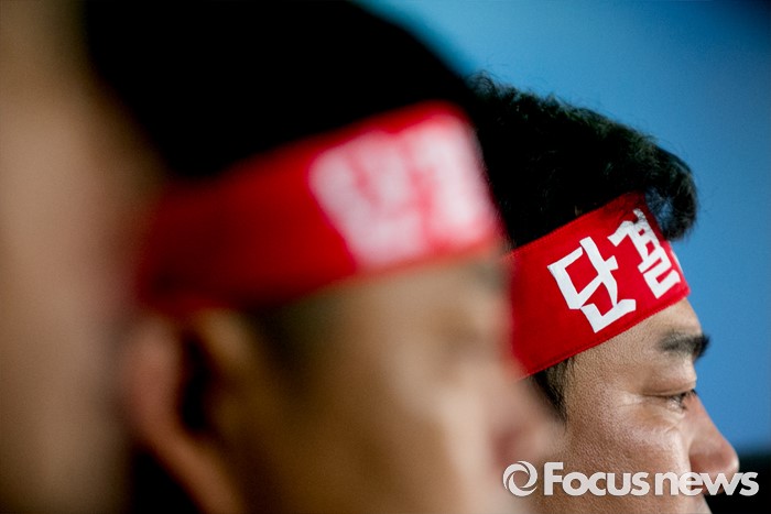 (서울=포커스뉴스) 13일 오전 서울 여의도 국회 정론관에서 조선업종노조연대 등 관계자들이 일방적 구조조정에 반대하는 총파업 선언 기자회견을 하고 있다.