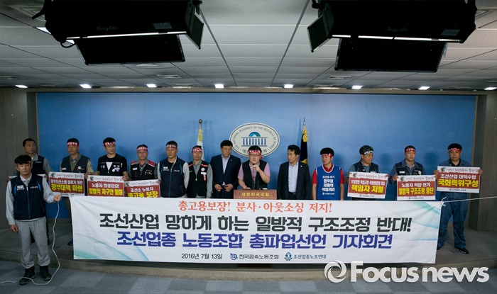 (서울=포커스뉴스) 13일 오전 서울 여의도 국회 정론관에서 조선업종노조연대 등 관계자들이 일방적 구조조정에 반대하는 총파업 선언 기자회견을 하고 있다.