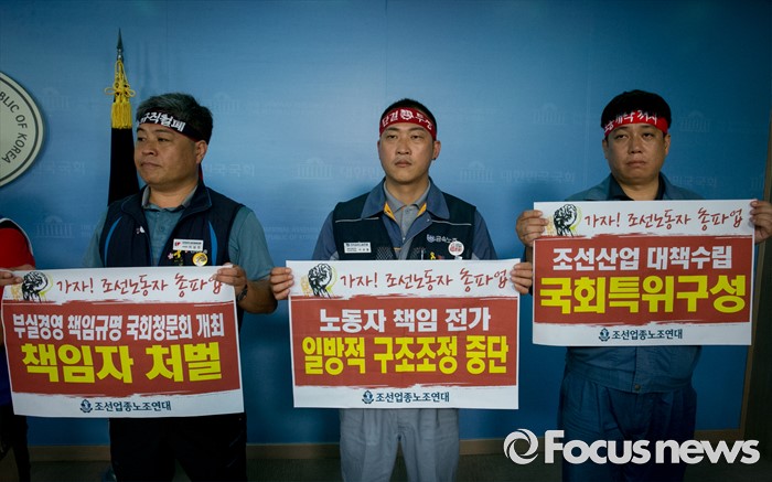 (서울=포커스뉴스) 13일 오전 서울 여의도 국회 정론관에서 조선업종노조연대 등 관계자들이 일방적 구조조정에 반대하는 총파업 선언 기자회견을 하고 있다.