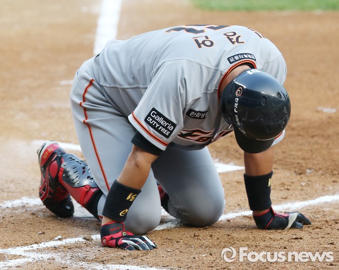 (서울=포커스뉴스) 13일 서울 잠실구장에서 열린 2016 프로야구 한화-LG 경기 1회초 2사 2,3루에서 한화 김경언이 중견수앞 3루타를 치고 3루를 지나 홈까지 뛰다 아웃된후 홈플레이트 위에 엎드려 있다.