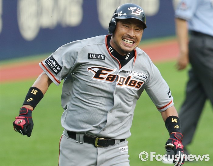 (서울=포커스뉴스) 13일 서울 잠실구장에서 열린 2016 프로야구 한화-LG 경기 1회초 2사 2,3루에서 한화 김경언이 중견수앞 3루타를 치고 3루를 지나 홈으로 온 힘을 다 해 달리고 있다.