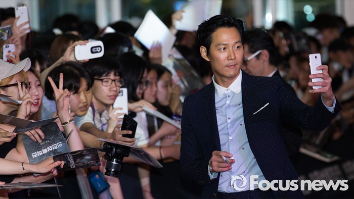 (서울=포커스뉴스) 13일 오후 서울 영등포구 타임스퀘어에서 열린 영화 '인천상륙작전' 레드카펫 행사에 참석한 배우 이정재가 팬들과 사진 찍고 있다.