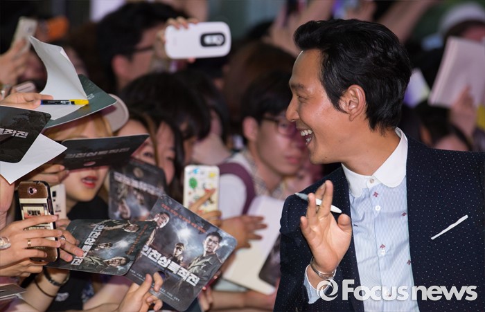 (서울=포커스뉴스) 13일 오후 서울 영등포구 타임스퀘어에서 열린 영화 '인천상륙작전' 레드카펫 행사에 참석한 배우 이정재가 팬들을 향해 미소 짓고 있다.