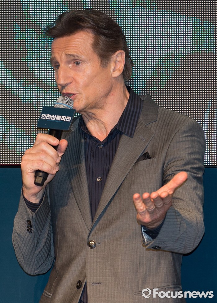(서울=포커스뉴스) 13일 오후 서울 영등포구 타임스퀘어에서 열린 영화 '인천상륙작전' 레드카펫 행사에 참석한 배우 리암 니슨이 인사말 하고 있다.