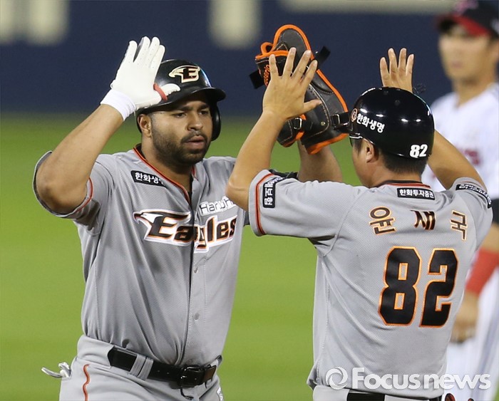 (서울=포커스뉴스) 13일 서울 잠실구장에서 열린 2016 프로야구 한화-LG 경기 8회초 2사 1,3루에서 한화 로사리오가 주자를 모두 불러 들이는 재역전 2루타를 치고 윤재국 코치와 하이파이브하며 환호하고 있다.