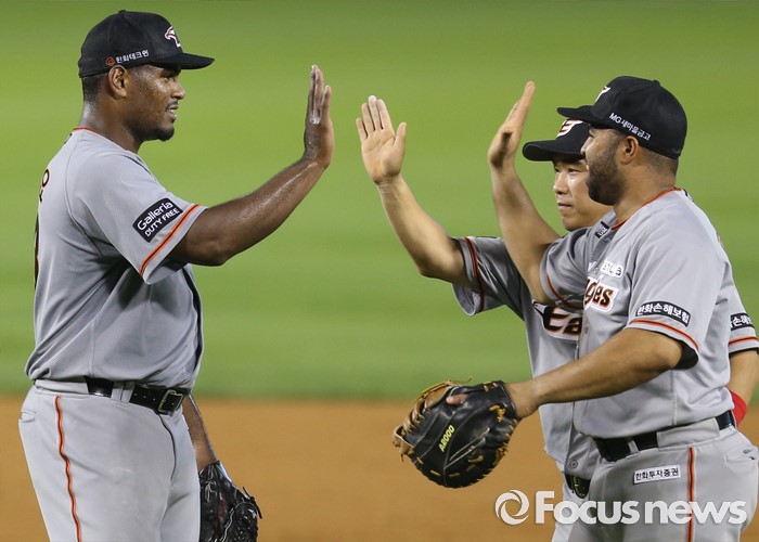 (서울=포커스뉴스) 13일 서울 잠실구장에서 열린 2016 프로야구 한화-LG 경기에서 LG에 재역전승을 거고 한화 승리투수 카스티요가 로사리오, 정근우와 하아파이브를 하고 있다.