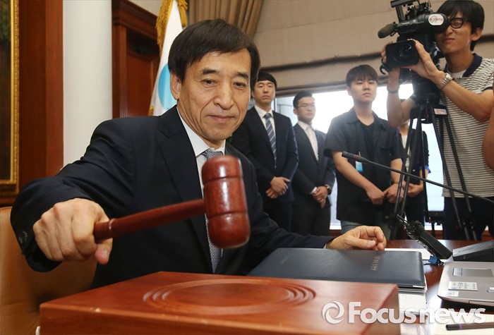 (서울=포커스뉴스) 14일 오전 서울 중구 한국은행에서 열린 제14차 금융통화위원회의에 참석한 이주열 한국은행 총재가 개회를 알리는 의사봉을 두드리고 있다.
