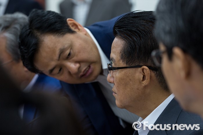 (서울=포커스뉴스) 박지원(오른쪽 두 번째) 국민의당 비상대책위원장과 김관영(오른쪽 세 번째) 원내수석부대표가 14일 오전 서울 여의도 국회에서 열린 원내정책회의에 참석해 대화 하고 있다.