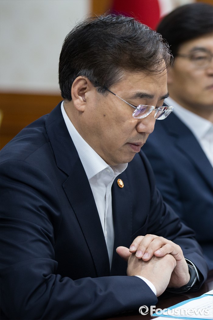 (서울=포커스뉴스) 이석준 국무조정실장이 14일 오전 서울 종로구 정부서울청사에서 열린 대구공항 통합이전 TF 첫 회의 시작을 기다리며 자료를 살펴보고 있다.