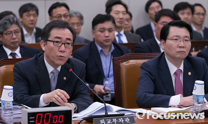 (서울=포커스뉴스) 14일 오전 서울 여의도 국회에서 열린 외교통일위원회 전체회의에 참석한 조태열 외교부 2차관이 의원들의 질의에 답하고 있다. 오른쪽은 김형석 통일부 차관.
