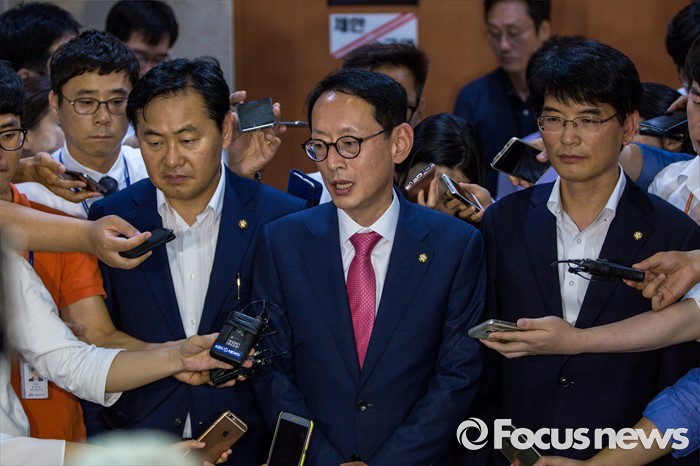 (서울=포커스뉴스) 여야3당 원내수석부대표가14일 오후 서울 여의도 국회에서 여야3당 원내수석부대표 합의사항을 발표한 뒤 취재진 질문에 답하고 있다. 이날 여야3당은 사드(고고도미사일방어체계) 국내 배치 결정에 따른 논한과 관련해 다음주 긴급 현안 질의를 위한 국회 본회의를 개최하는데 합의 했다고 밝혔다. 왼쪽부터 김관영 국민의당 원내수석부대표, 김도읍 새누리당 원내수석부대표, 박완주 더불어민주당 원내수석부대표.