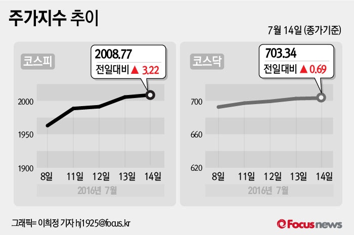 (서울=포커스뉴스) 14일 코스피지수는 전날보다 0.16%(3.22포인트) 오른 2008.77에 장을 마쳤다. 코스닥지수는 전일 대비 0.10%(0.69포인트) 오른 703.34에 마감했다.