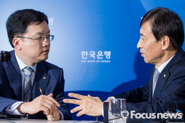 (서울=포커스뉴스) 이주열 한국은행 총재가 14일 오후 서울 중구 한국은행에서 최근의 물가안정목표제 운영상황에 대해 설명 도중 장민 조사국장과 대화하고 있다.