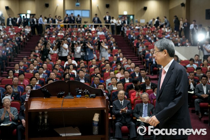 (서울=포커스뉴스) 14일 오후 서울 여의도 국회 의원회관에서 열린 새누리당 전국위원회에 참석한 김희옥 혁신비대위원장이 인사말을 위해 단상으로 향하고 있다.