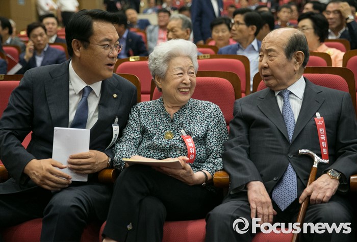 (서울=포커스뉴스) 14일 오후 서울 여의도 국회 의원회관에서 열린 새누리당 전국위원회에 참석한 정진석(왼쪽부터) 원내대표, 이연숙, 김수한 상임고문이 대화하고 있다.
