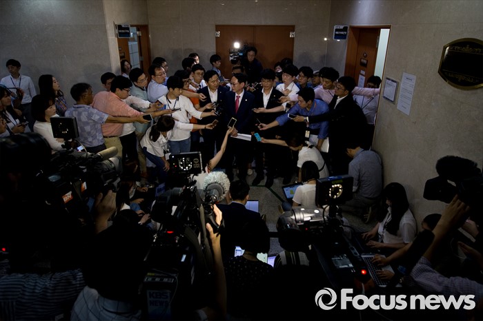 (서울=포커스뉴스) 여야3당 원내수석부대표들이 14일 오후 서울 여의도 국회에서 여야3당 원내수석부대표 합의사항을 발표한 뒤 취재진 질문에 답하고 있다. 이날 여야3당은 사드(고고도미사일방어체계) 국내 배치 결정에 따른 논한과 관련해 다음주 긴급 현안 질의를 위한 국회 본회의를 개최하는데 합의 했다고 밝혔다. 왼쪽부터 김관영 국민의당 원내수석부대표, 김도읍 새누리당 원내수석부대표, 박완주 더불어민주당 원내수석부대표.