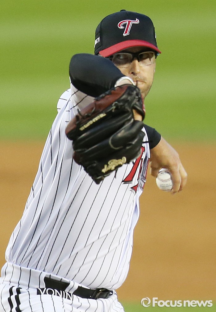 (서울=포커스뉴스) 14일 서울 잠실구장에서 열린 2016 프로야구 한화-LG 경기에서 LG의 새 외국인 투수 허프가 3회에 등판해 위력적인 투구를 하고 있다.