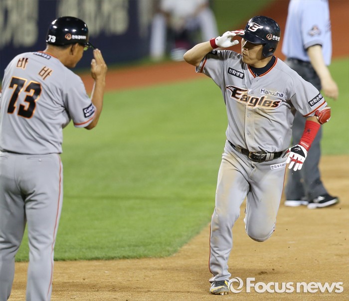 (서울=포커스뉴스) 14일 서울 잠실구장에서 열린 2016 프로야구 한화-LG 경기 6회말 2사후 한화 정근우가 좌월 솔로 홈런을 치고 3루를 돌며 바바 코치에게 경례를 하고 있다.
